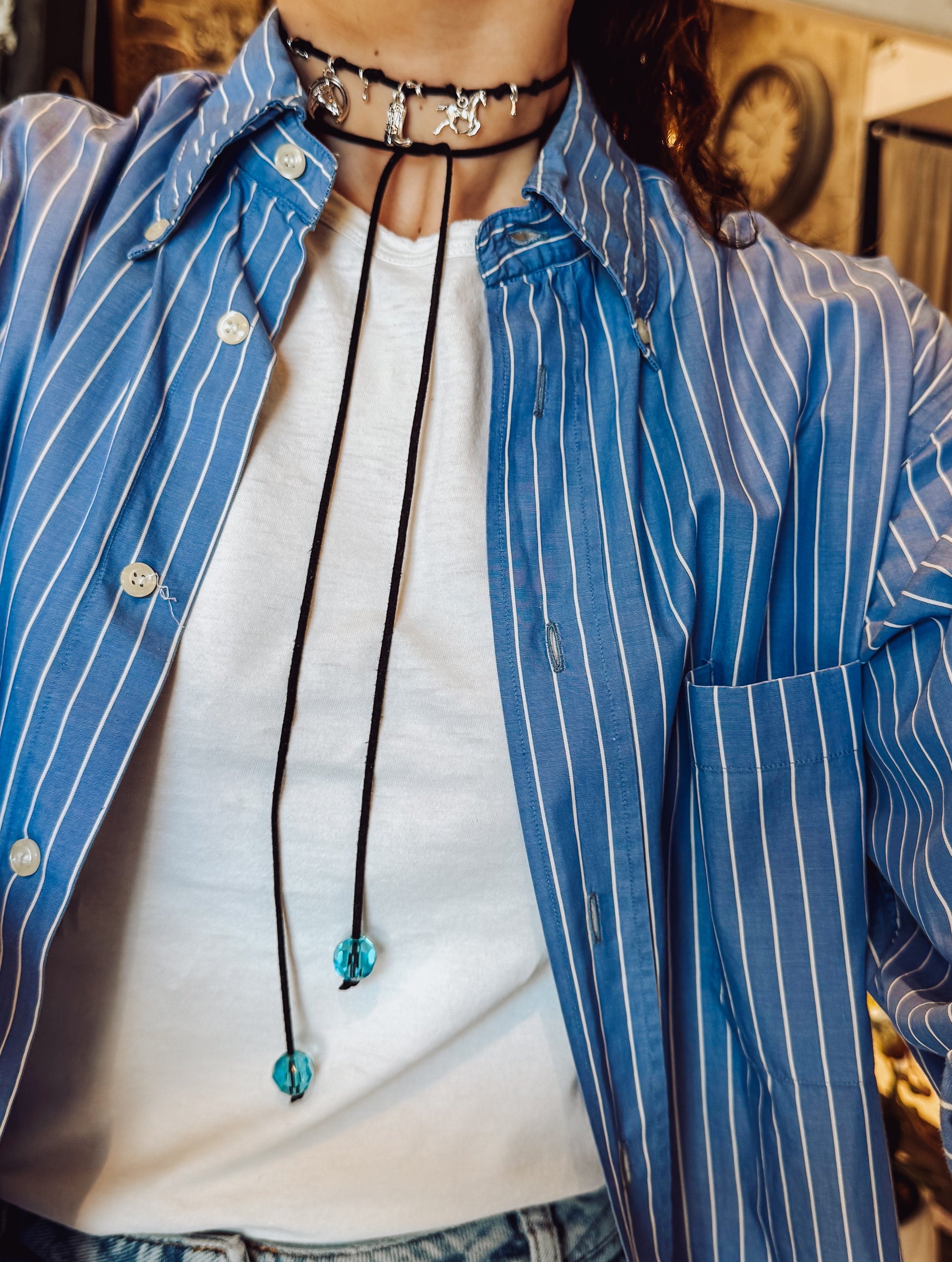 FAV #11 è la collana per chi non ha voglia di passare inosservata: laccio nero, charm argentati e un mood che strizza l’occhio al western ma resta super contemporaneo.