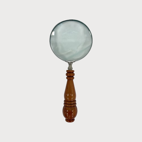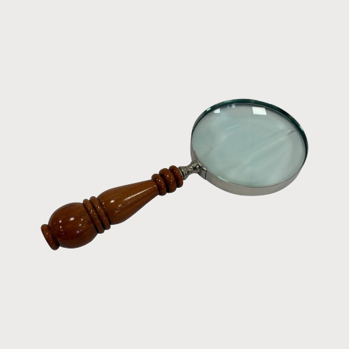 La grande lente in vetro, ampia e luminosa, è incorniciata da una struttura metallica dal gusto classico. Il manico in legno caldo, con lavorazione tornita e finitura liscia, dona equilibrio e raffinatezza. Il tono del legno è più chiaro e naturale rispetto a quanto possa sembrare in foto, con una presenza elegante ma non pesante.