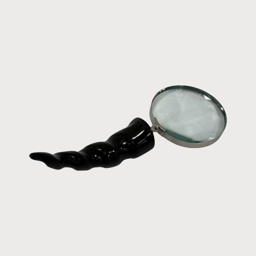 La lente ampia, incorniciata in metallo, bilancia la profondità del nero con una presenza luminosa e raffinata. Appoggiata su libri antichi o su una scrivania in legno caldo, crea immediatamente un’atmosfera da studio d’epoca, intima e sofisticata.