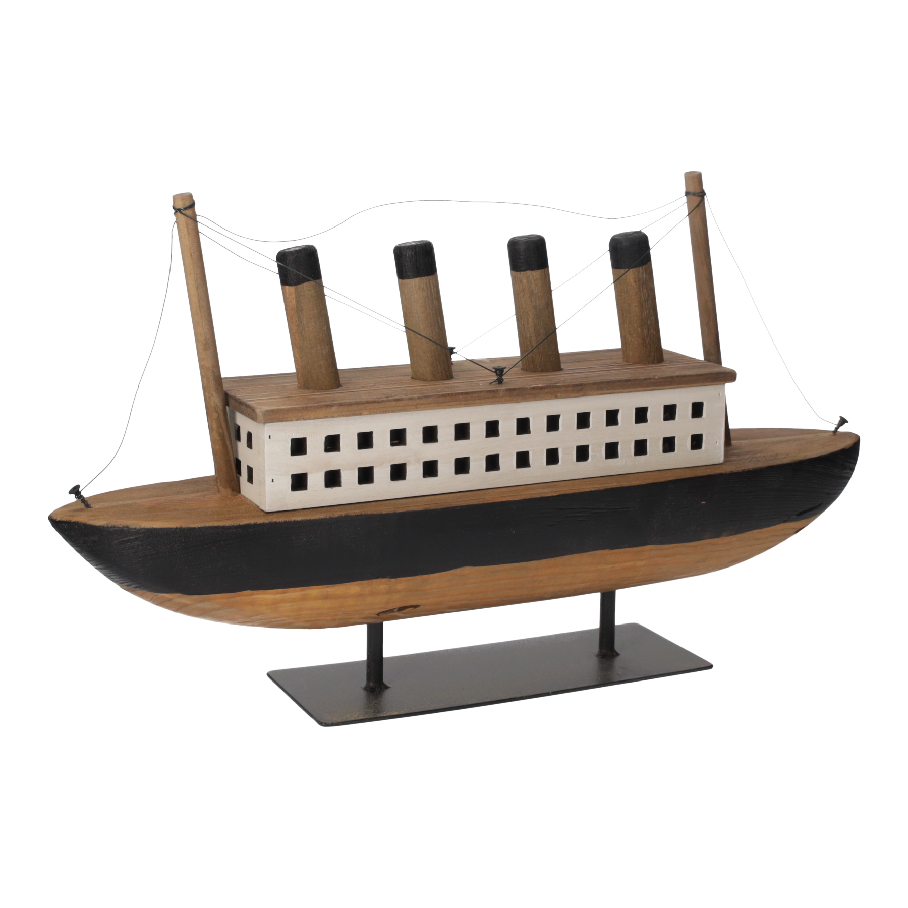 Questo panfilo decorativo unisce legno naturale, dettagli neri e linee pulite in un equilibrio perfetto tra stile nautico e gusto country chic. La struttura semplice ma curata, con ciminiere e corde decorative, dona movimento e carattere senza risultare eccessiva.