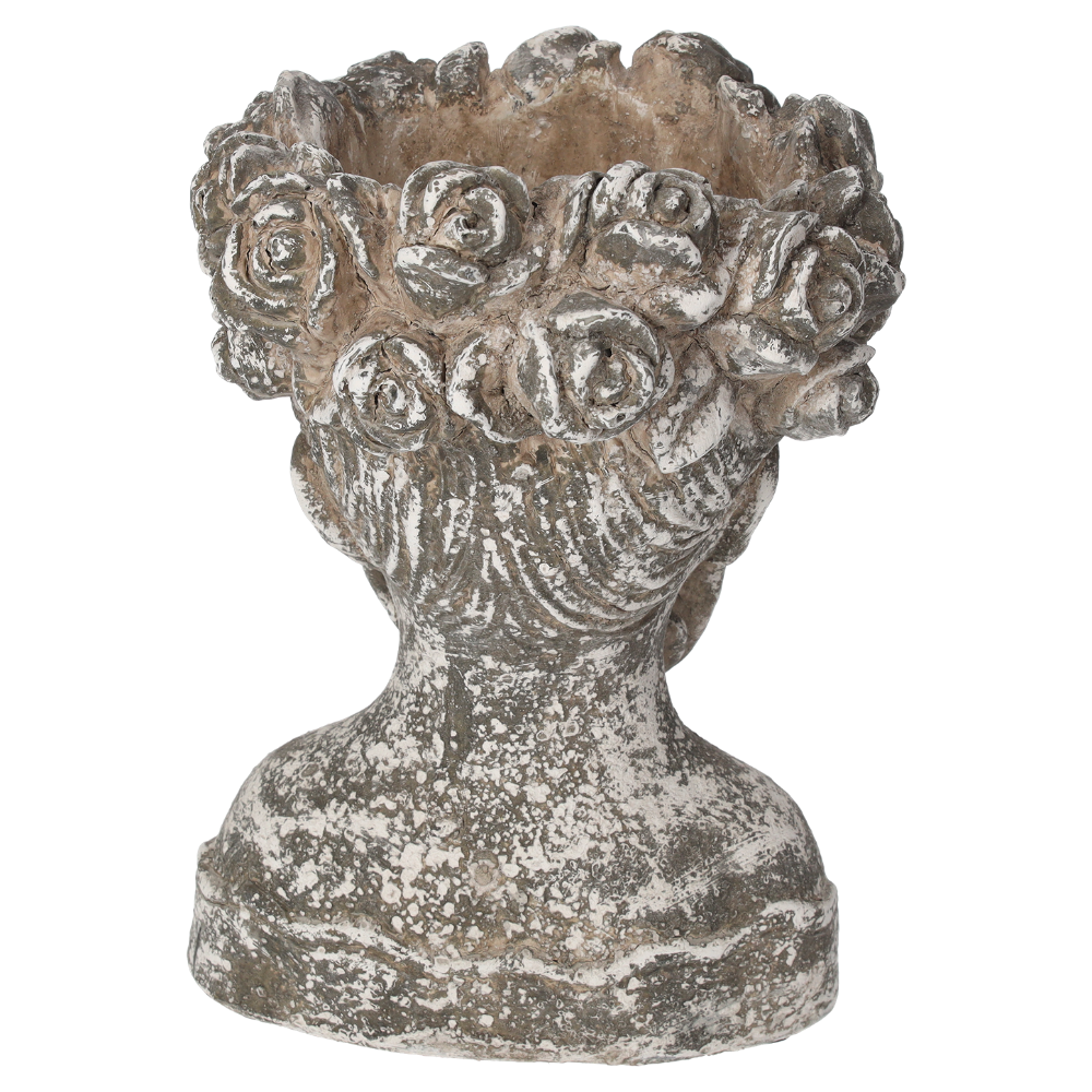 Questa testa porta vaso misura 30 cm di altezza per 21 cm di larghezza ed è caratterizzata da una finitura effetto pietra vissuta, con patina anticata che ne esalta i dettagli scolpiti. La corona di rose tra i capelli e l’espressione dolce, quasi meditativa, la rendono intensa ma delicata.
